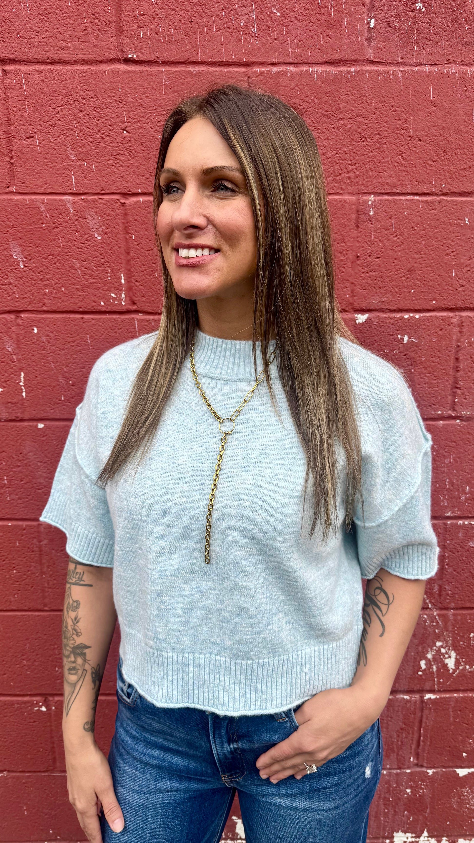 Effortless style meets comfort in this slightly cropped short sleeve sweater. Crafted in a soft sky blue, it features exposed seams for an on-trend look and ribbed detailing at the hem and sleeves for a polished finish. True to size, this versatile piece layers beautifully or stands alone as a casual essential.