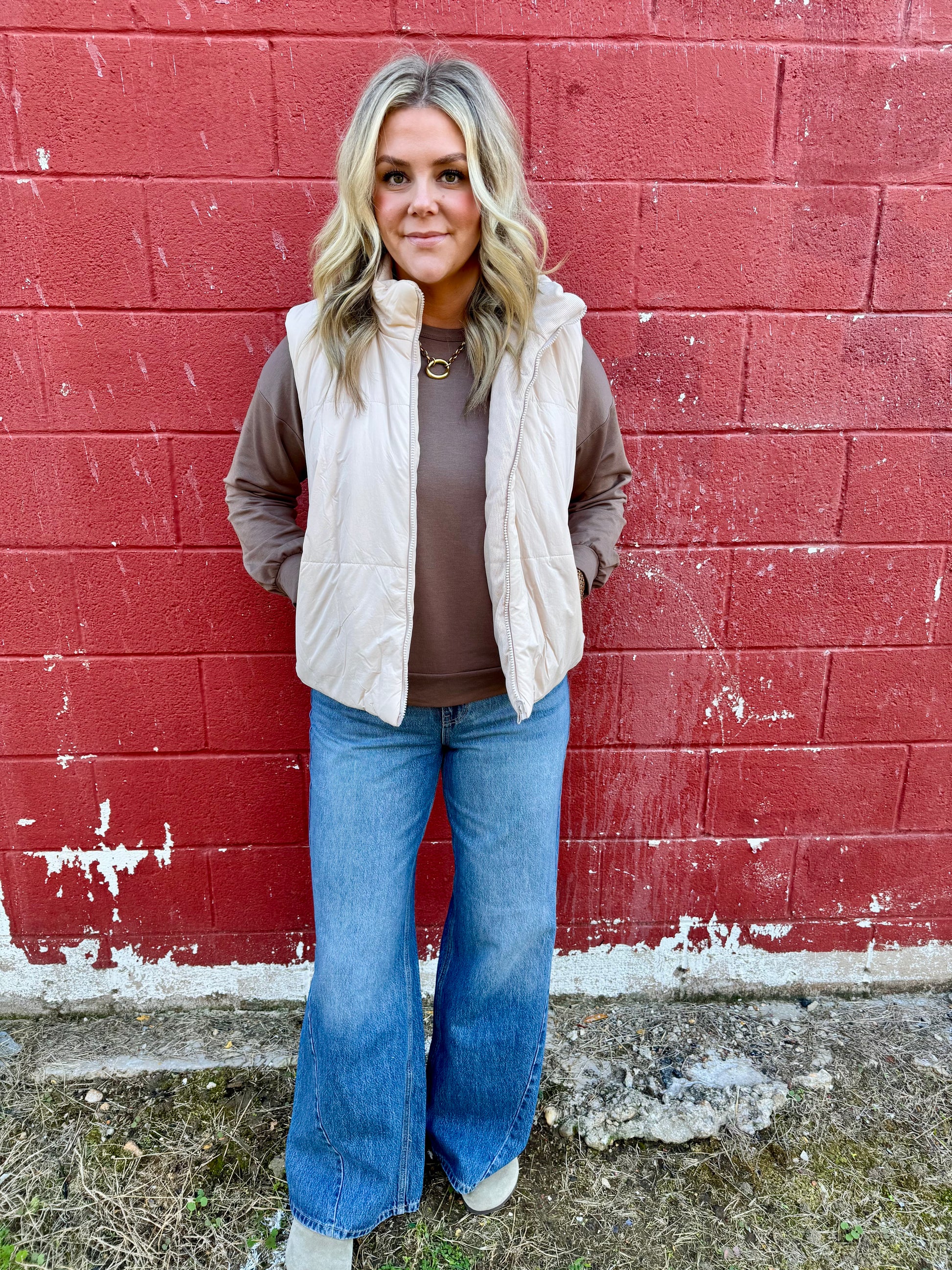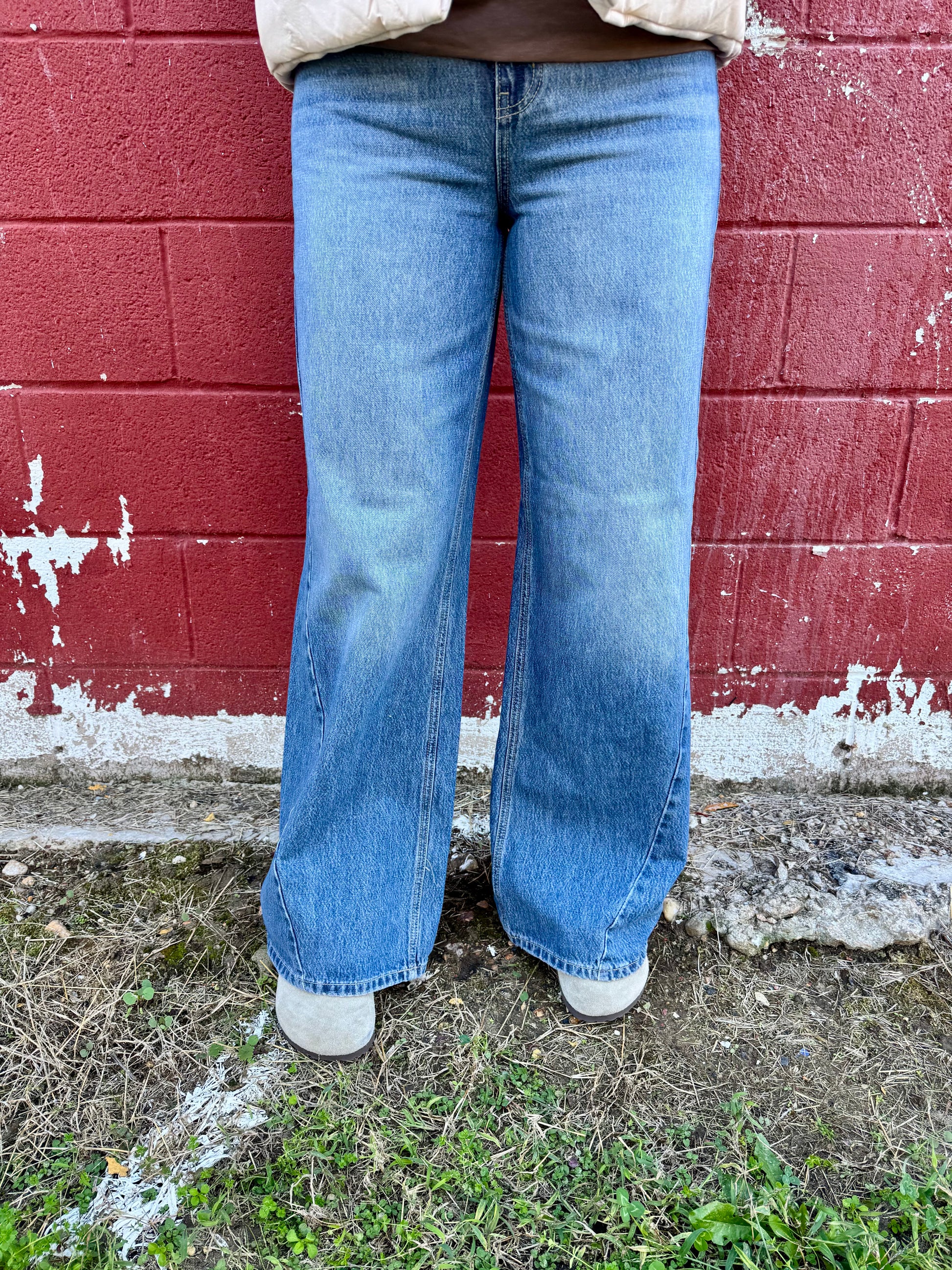 High Rise Wide Leg Medium Denim Belt Loops + Zip Fly Import Front Rise 11 3/4", Inseam 32" 100% Cotton