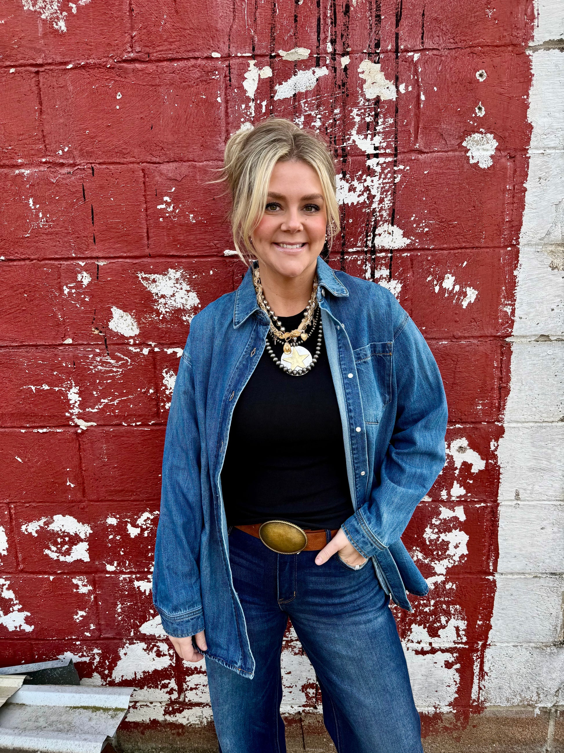 Oversized shacket, if you are 5’5” or shorter it would make a perfect dress will tall cowboy boots. Has pockets. Kamri is a size 8 and wore the medium.